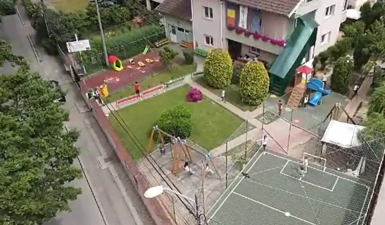 Spațiul exterior este generos (1200 mp), incluzând spații cu amenajare specială: teren de sport (volei, tenis, baschet, mini fotbal), piscină (vara), spații de joacă (tiroliană, tobogane, leagăne, arcadă, nisipar), jucării de exterior (căsuțe, balansoare, tobogan, mașinuțe, triciclete, trotinete), foișor pentru ateliere în aer liber, spațiu cu gazon natural pentru relaxare.